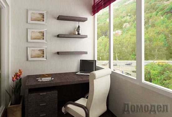 Второй вариант, который сегодня наиболее популярен – соединить балкон с комнатой для увеличения объема, обычно его просто утепляют, чтобы зимой было комфортно, после чего там можно поместить компьютерный или письменный стол, несколько шкафчиков и освещение. Таким образом выйдет организованное место для работы в любое время суток, а основная часть прилегающей комнаты останется свободной для размещения всего необходимого.