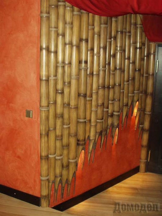 Бамбук - очень красивый отделочный материал. Но его недостаток заключается в том, что он визуально уменьшает помещение. Если у вас небольшая жилая площадь, то им можно отделать одну из стен или потолок комнаты. Все стены и потолок не рекомендуется отделывать бамбуком, так как это может зрительно уменьшить территорию.