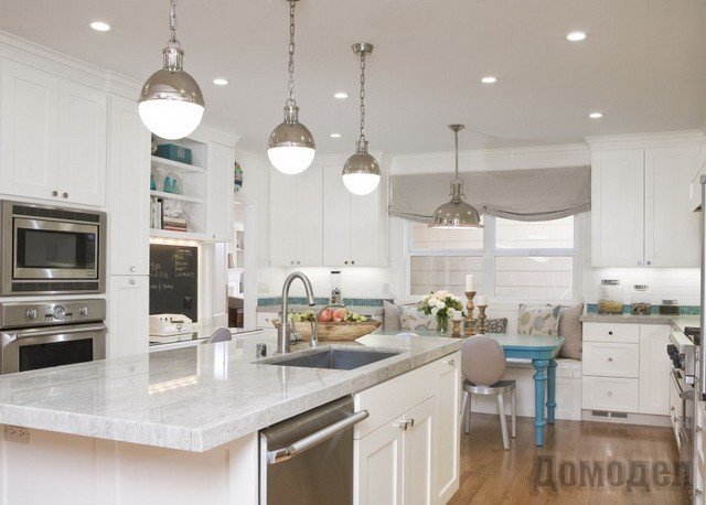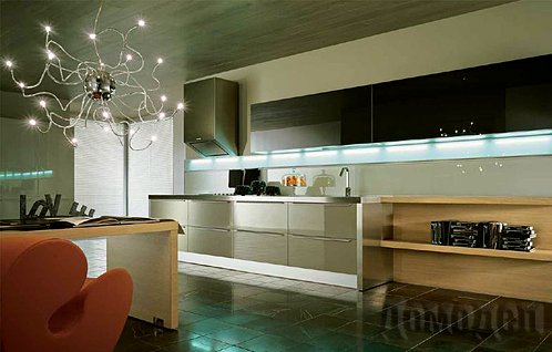 Чтобы можно было выделить на кухне те или иные места, нужно установить софиты, которые смогут решить данную проблему. Создать общий свет можно с помощью люстр, так же, особой популярностью сегодня пользуются и точечные светильники, которые будут расположены на потолке.