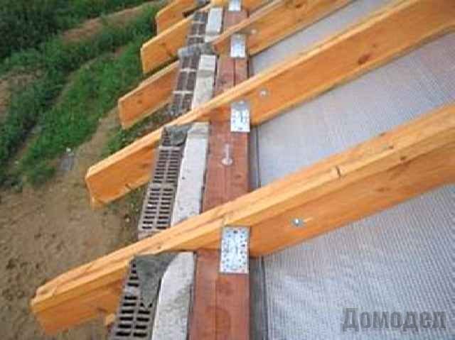 После завершения монтажа стропил укладывается обрешетка. Для этого используется доска толщиной 25мм. Чтобы предотвратить разрывы материала кровли, обрешетка укладывается в разбежку. Если Вы хотите создать карниз, то для этого обрешетка укладывается с выпуском в 400 мм над фронтом.