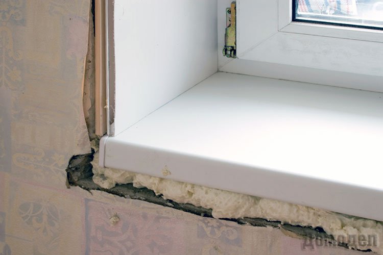 Традиционно, подоконник устанавливается на монтажную пену, как можно более плотно заполняется зазор между оконным блоком и закрепленным горизонтально подоконником. Основное требование – максимальное прилегание со всех трёх сторон, иначе появятся «мостики холода». Излишки пены после полного затвердевания аккуратно срезаются. Стыки изолируются силиконовым герметиком.