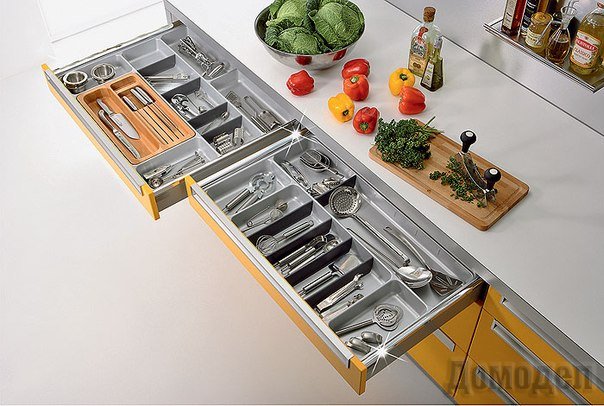 Существуют маленькие хитрости, чтобы кухня вместила необходимую мебель, технику. Многочисленные приборы намного облегчили приготовление пищи, и отпала необходимость в многочисленных рабочих поверхностях. Вместо них на кухне располагают стильные барные стойки. Под их столешницами уместятся в выдвижных ящиках столовые приборы, посуда. На задней стене, на полках и стеллажах, размещают бутылки, банки с сыпучими продуктами, мелкую бытовую технику.