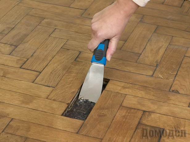 • Деформированные элементы подвергаются точечному ремонту. Старые планки чистят от грязи, грунтуют освобожденное место и затем выкладывают паркет.