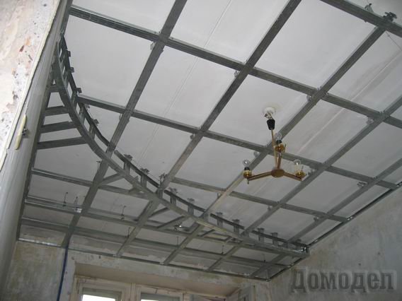 В начале работы монтируется каркас из стальных профилей на потолке. По периметру поверхности (или под потолком на стене) с помощью уровня закрепляют профиля. Если крепеж выполняется на стене, то отступ от потолочной поверхности — 10 см.