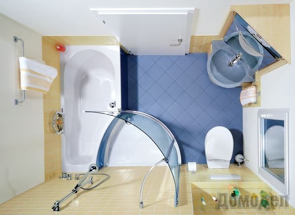 Неплохой вариант разместить в маленькой комнатке угловую ванную, а также угловую раковину и еще можно поместить раковину над ванной.