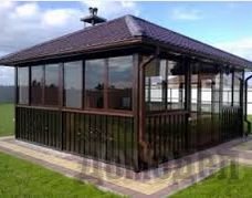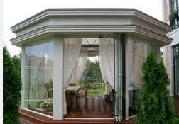 Построенная беседка имеет большие размеры и остеклить ее кажется невозможно. Не расстраивайтесь, в этом случае пригодится специальная «портальная» система. Фрамуга, которая движется , как дверь в маршрутном такси, отъезжает немного назад и откатывается в сторону. Для беседок с сложной структурой строения используют безрамное остекление, то есть без вертикальных перемычек. Стекла для этих рам выполнены из толстых закаленных стекол, они бываю прозрачными или тонированными. При таком остеклении обеспечивается максимальное светопропускание.