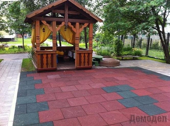 В нашей стране резиновую плитку все чаще используют при обустройстве дачных и садовых участков. Чаще всего из неё делают садовые дорожки и площадки — детские, спортивные или для отдыха. Для сада имеется возможность выбора изделий самой разной формы, из них можно сделать яркую, солнечную и многоцветную дорожку. Причем при условии качественной укладки через неё не прорастают сорняки, да и дождь её не размоет.