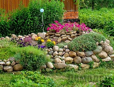 Немаловажная составляющая будущей альпийской горки – камни, к выбору которых тоже нужно отнестись серьезно. Их количество зависит от величины горки. Чем больше планируемая горка, тем больше камней потребуется. Строгих правил укладки нет. Понадобится лишь фантазия. Задача - красиво выложить несколько каменных ярусов. Внизу должны быть большие камни, а вверху – маленькие. Укладывать камни следует не слишком близко, а между ними нужно сыпать плодородную почву. Здесь буду посажены потом растения. На самую верхушку следует подобрать и положить лучший или оригинальный камень. В итоге должна получится живописная естественная альпийская горка.