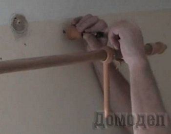 Правила монтажа остаются такими же, как и в случае монтирования карнизов на стене. Определяем место для монтажа кронштейнов на противоположных стенах, сохраняя при этом достаточное расстояние между занавесом и окном, нужно учитывать, прежде всего, ширину подоконника. Устанавливаем тяги таким же образом, как и ранее. Обратите внимание, чтобы размеров дюбелей и болтов хватило для поддержания веса шторы.