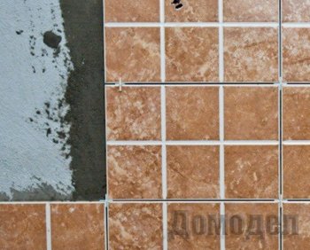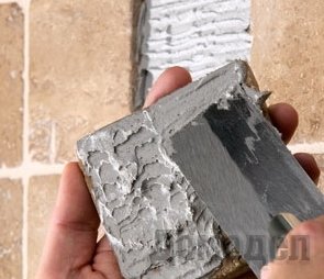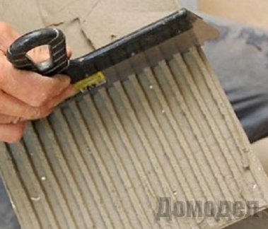 Цемент или другой состав для закрепления плитки наносят зубчатым шпателем.