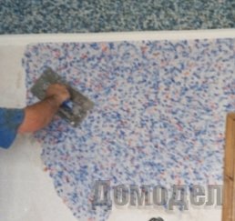 - нанести смесь на маленький участок поверхности при помощи шпателя небольшими дозами и разгладить валиком/кельмой до равномерного слоя и так шаг за шагом пока не будут окрашены все стены. Сохнет не более 2 суток.