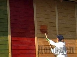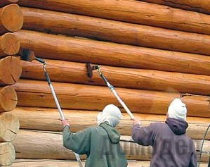 Окрашивается деревянная поверхность достаточно просто. Для этих целей применяется широкая и узкая кисть. Окрашивание нужно начинать производить с угла верхнего края деревянной постройки и так постепенно опускаться вниз. Важно, чтобы на поверхности не было бы потёков.