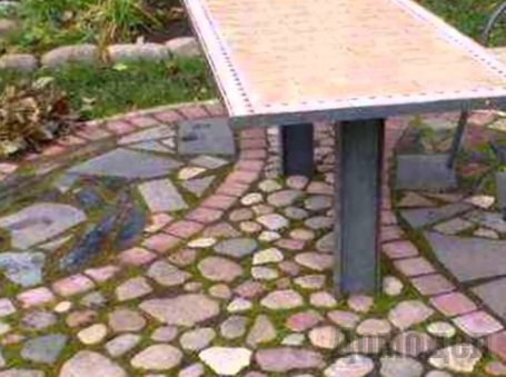 - Укладка камней. Предпочтительным является материал с плоскими сторонами, но, как правило, камни попадаются разные. Поэтому при укладке нужно стараться более плоскую сторону направлять вверх, для удобства последующей эксплуатации. Процесс укладки следует производить неторопливо, устанавливая каждый камень наиболее оптимальным образом, соотнося его с соседними фрагментами. После того, как камень уложен, его утрамбовывают в песочную подушку с помощью полотка с деревянной наставкой, при этом соизмеряя силу ударов, во избежание повреждения материала. После того, как вся площадь дорожки уложена, с помощью песка засыпают все пустоты между отдельными фрагментами укладки. Сделать это можно и при помощи цементного раствора, в таком случае поверхность будет более крепкой.