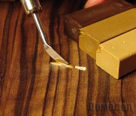 - Шпаклевка-расплав. С помощью этого вещества также можно заделать повреждения ламината средней степени. В целом работа с ней похожа на работу с пастой, с одним отличием, что шпаклевку перед использованием необходимо разогреть, так как она продается в твердом состоянии.