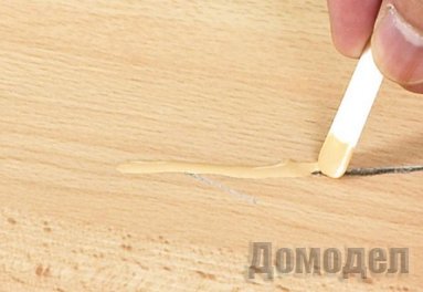 - Карандаш из воска. Позволяет заделать мелкие повреждения и трещины. Выпускается в большой цветовой гамме, что позволяет подобрать заделочный материал, наиболее подходящий к ламинату. Инструкция по применению воскового карандаша очень проста: ламинат протирают и очищают повреждение от пыли. Затем при помощи карандаша заполняют царапину, добиваясь максимального слияния с уровнем поверхности. После этого с помощью сухой мягкой ветоши производиться финальная полировка места реставрации.