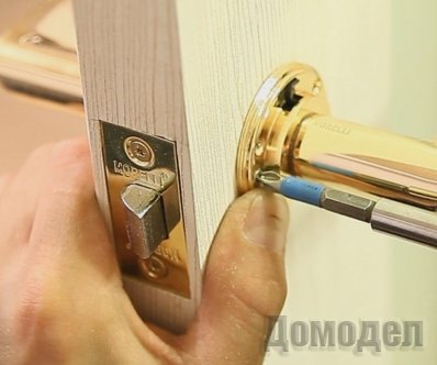 Вставляем в отверстия ось ручки и ось фиксатора. Надеваем с двух сторон ручки и проверяем их свободное и плотное примыкание к дверному полотну.
