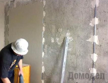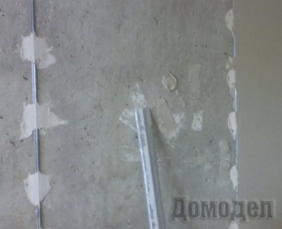 Перед установкой штукатурных маячков поверхность очищается и грунтуется. Маячок устанавливается на самую выступающую точку. Если эта точка слишком выпирает, есть смысл в ее уменьшении путем откалывания. Иначе расход раствора будет неоправданно высоким.