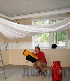 Основной инструмент здесь – тепловая пушка. Именно она создает необходимый уровень высокого давления воздуха, под воздействием которого будет происходить монтаж потолка.