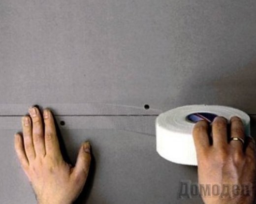 После предыдущих операций, поверхность полотна гипсокартона грунтуется. Затем нужно оклеить места стыков с помощью армированной ленты. Процесс этот очень ответственный и имеет особое значение, ведь от этого зависит надёжность и прочность всей конструкции. Важным моментом при выполнении этого процесс будет нахождение шляпок от саморезов, следить нужно затем, чтобы они были вровень с поверхностью. Возвышение их над плоскостью пласта сулит испорченным эстетичным видом, даже когда поверхность будет обработана и покрашена.