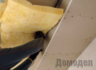 Теперь приступают к закладке самого утеплителя. Плиты минеральной ваты должны входить в распор между частями каркаса. Если остаются зазоры, их впоследствии заполняют монтажной пеной. Чтобы теплоизолятор закрепился лучше, его также прихватывают металлическими скобами к брусьям и дюбелями к потолку. Если изоляционные работы проводятся в помещении с влажным воздухом, минеральную вату дополнительно понадобится закрыть слоем гидроизоляции. Хорошо для этого подойдет, например, полиэтиленовая пленка. Но лучше использовать супердиффузионную мембрану, которая может отводить пар от самого звукоизолятора.
