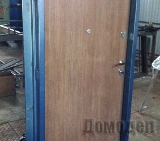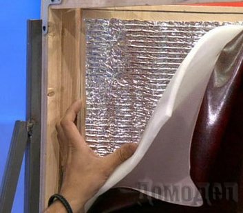На одну из стенок железной двери прикручивают саморезами лист ДВП и на него приклеивают тепло материал. Процесс его утепления аналогичен. Снаружи такой каркас зашивают листами МДФ или ДСП.