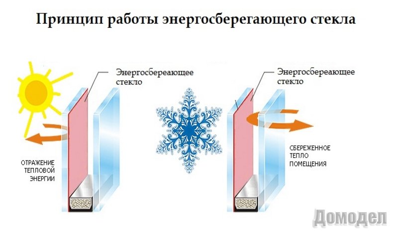 На внешнюю сторону энергосберегающего стеклопакета нанесено специальное покрытие, которое отфильтровывает солнечный ультрафиолет, позволяя поддерживать летом прохладную атмосферу внутри помещения, что позволяет от частой эксплуатации кондиционера. А на внутренней стороне стекла имеется также покрытие, но уже отражающее тепло изнутри комнату, препятствуя его выходу на улицу. В итоге получается двойная защита от потери ресурсов.