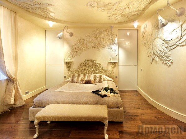 Несколько выступающих элементов на потолке или стенах, и этого вполне достаточно, что бы осуществилось преобразование комнаты. Для других способов, изменения комнаты, возможен более усложненный и большой барельефный вариант центральной композиции всего помещения.