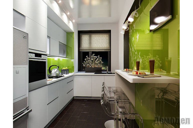 Стены, потолок, мебель и оформление окна нужно выдержать в одной цветовой гамме светлых тонов Это придаст маленькой кухне легкость и простор. Зрительно расширить пространство можно при помощи «фартука», выполненного в зеркальном варианте.