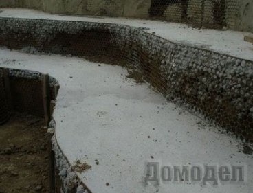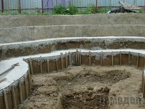 Когда каркас обвяжут, начинается заливка дна бетоном, который необходимо залить так, чтобы был хороший уклон в сторону стены, где будет происходить слив водной массы в канализацию.