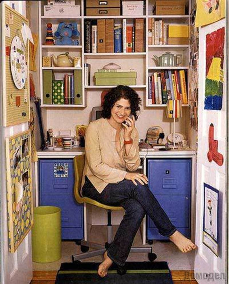 ❹ Домашний офис. Если вы заняты удаленной работой, то можете превратить кладовку в домашний офис. При правильном использовании места вы сможете поставить в ней маленький компьютерный стол, стул и пару стеллажей.