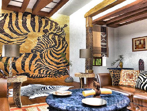 Для африканского стиля в интерьера показательны страсть и чувственность. Тёплая цветовая гамма согреет помещение визуально в зимние вечера. Если удастся найти накидку из шкуры леопарда на кровать, будет просто отлично. Или же можно отыскать и прикупить искусственный мех в магазинах тканей, и сшить из него лоскутное покрывало на диван.