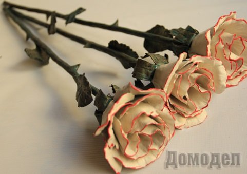 Есть также мастера, которые предпочитают создавать розы по одному листику – это очень долгий и кропотливый процесс, но результат того стоит. Обычно на одном стебле размещают от 15 до 25 лепестков, приваривая их группами друг к другу.