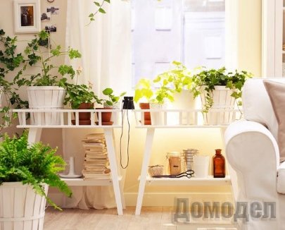 На однотонном фоне стоит расположить цветы с мелкими листьями, а у стены, оклеенной обоями с рисунком, можно поставить растения с крупными листьями. Растения в больших горшках лучше расположить на полу, так как на столе или на подоконнике они будут смотреться громоздко. На подоконнике лучше поставить одиночные растения, которые выглядят они не хуже композиций. На высоких подставках, в подвешенных к стене или потолку горшках лучше высадить ампельные растения или лианы.