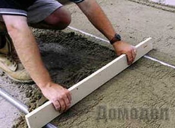 Замешав раствор начинаем переносить его лопатой на пол. Равномерно распределяем между направляющими. Затем, двигая правило перпендикулярно направляющим, снимаем лишнее.